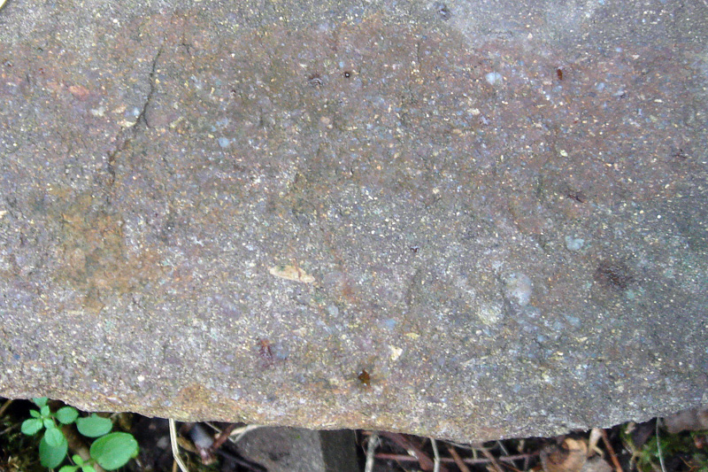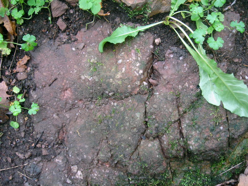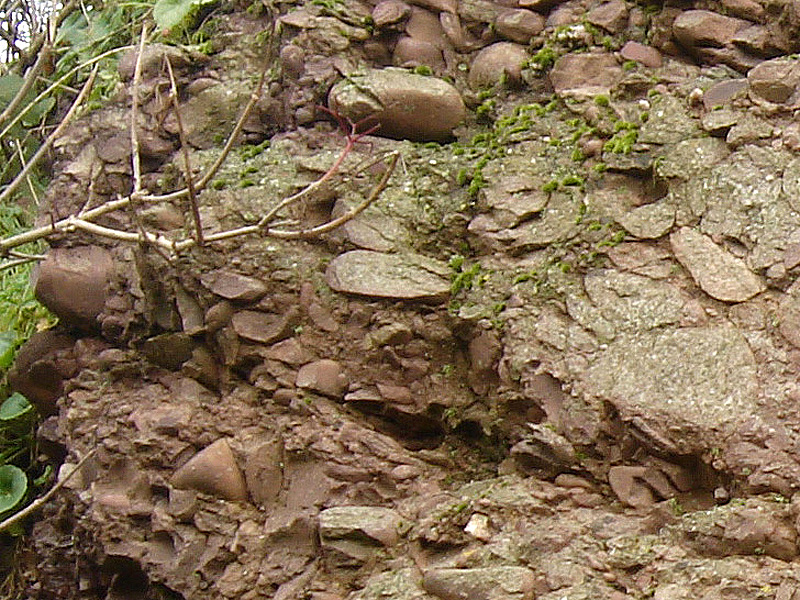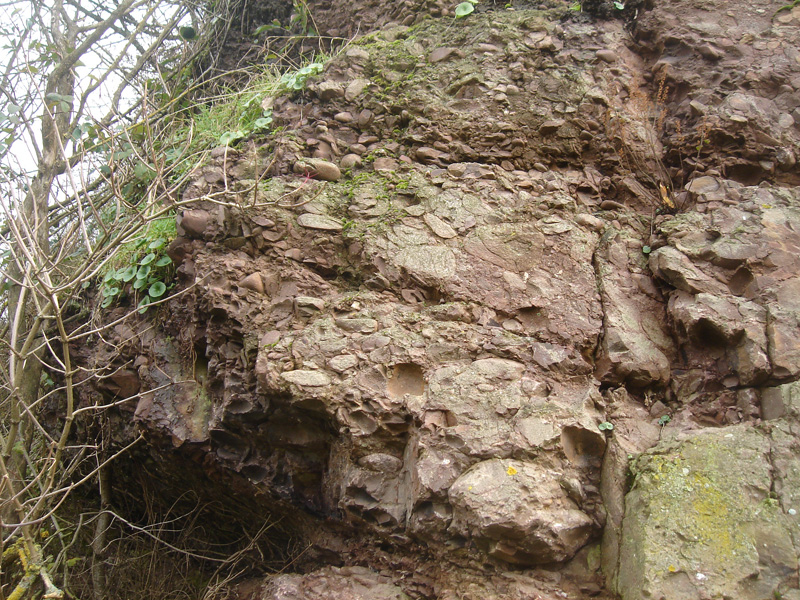 Les galets, presque jointifs, sont enrobés dans une matrice gréseuse pourprée. La couleur rouge, est due à la présence d’oxydes de fer (oligiste et goethite) formés en milieu continental et issus du lessivage du continent cadomien soumis à l’érosion. Des galets sont eux-mêmes recouverts d’un mince enduit ferrugineux. |