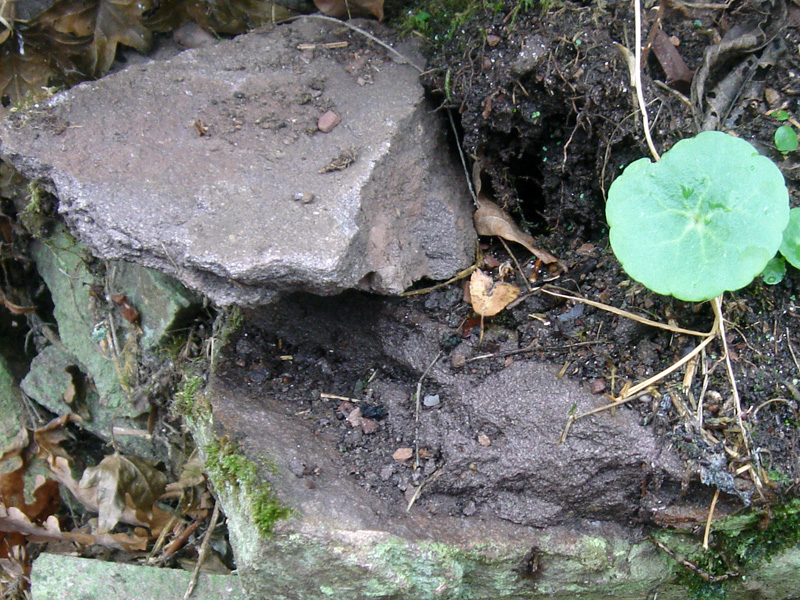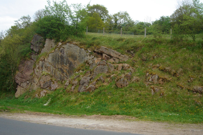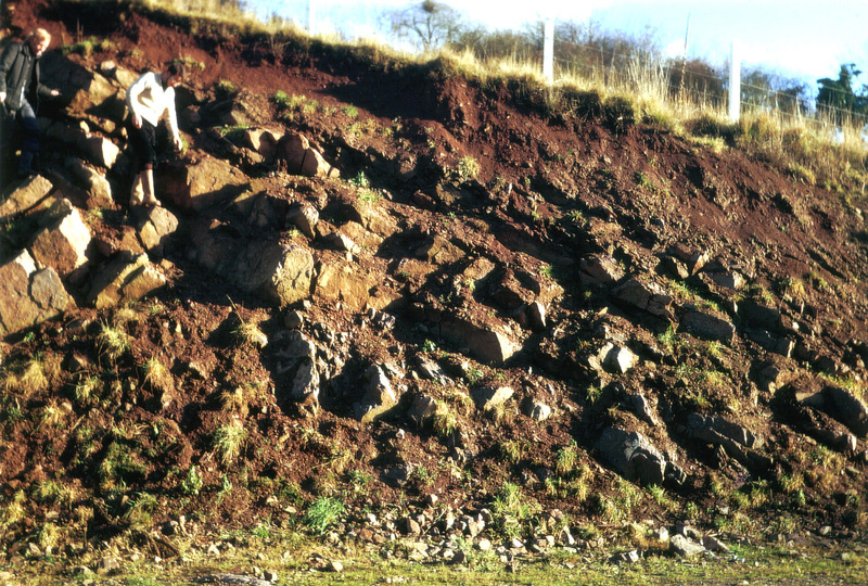 L’aspect rubéfié de l’affleurement était bien visible après le rafraîchissement par d’anciens travaux d’élargissement de la route. |
