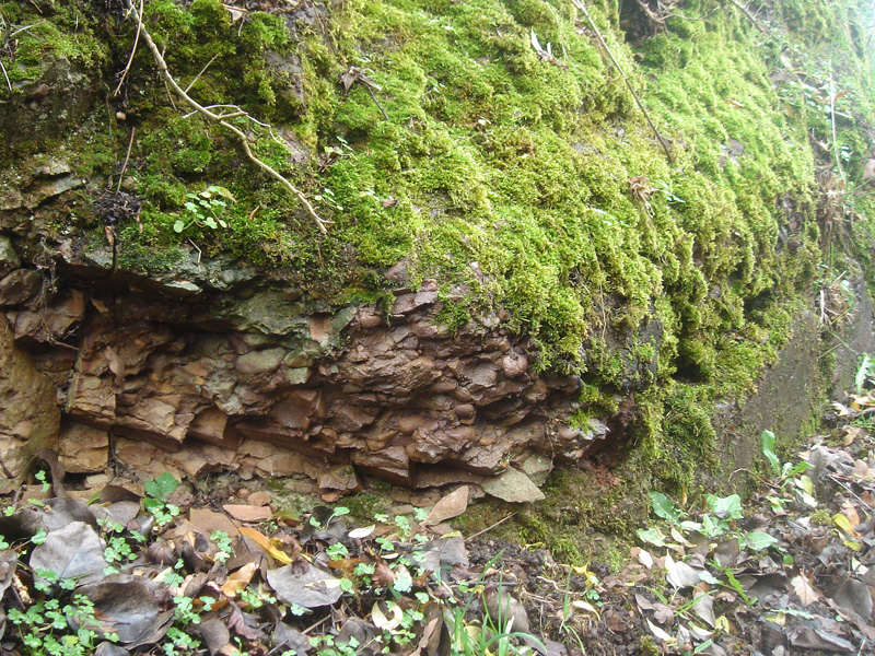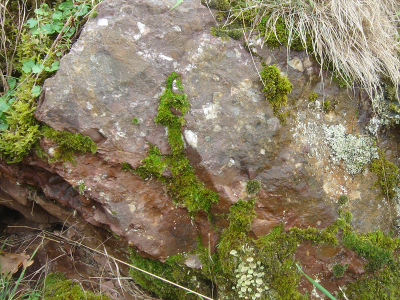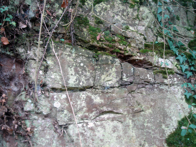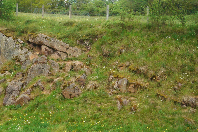 Affleurements dans le chemin du Caillouet Les arkoses cambriennes affleurent largement en bordure du chemin, soit dans de petits escarpements rocheux ou soit en surface structurale.