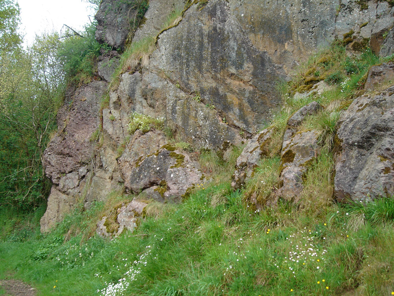 L’escarpement rocheux expose des conglomérats pourpres en bancs massifs surmontés par des arkoses en bancs plus minces. Plongeant de 20 degrés vers le sud, ces couches de la base du Cambrien appartiennent au flanc nord du synclinal d’Urville. Elles ont été plissées lors de l’orogenèse varisque. |