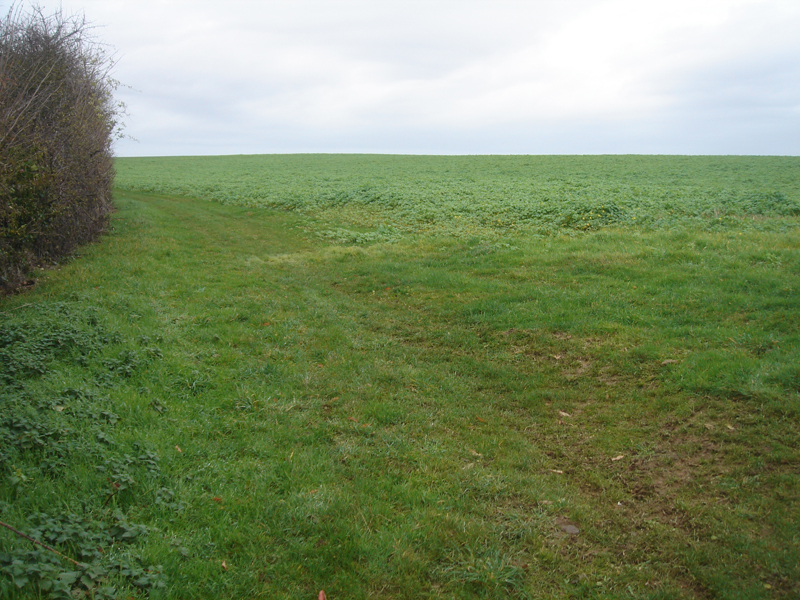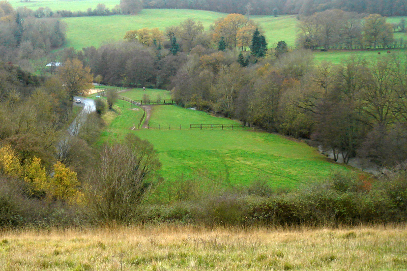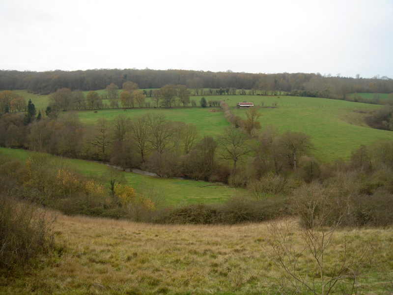 Entre la route D132 (à gauche) et la Laize (à droite), les alluvions récentes de la Laize forment une étendue plane couverte de prairies inondables.