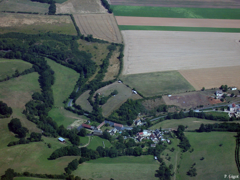 En rive droite de la Laize (en haut sur la photo), les calcaires jurassiques subhorizontaux du plateau supportent un paysage de champs ouverts. Par contre, sur le coteau de la rive droite et en rive gauche de la Laize (en bas sur la photo), les terrains plissés du Précambrien et du Paléozoïque (grès et schistes) supportent un paysage de bocage.