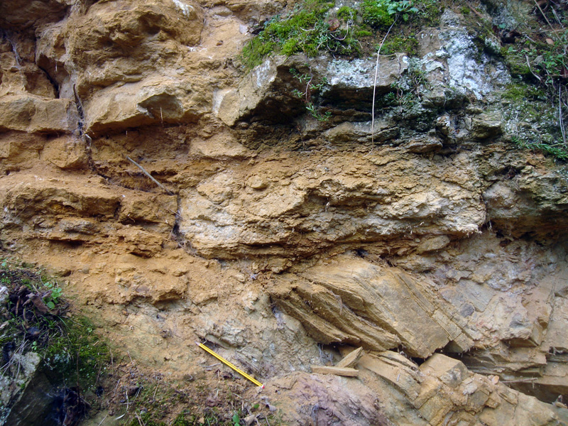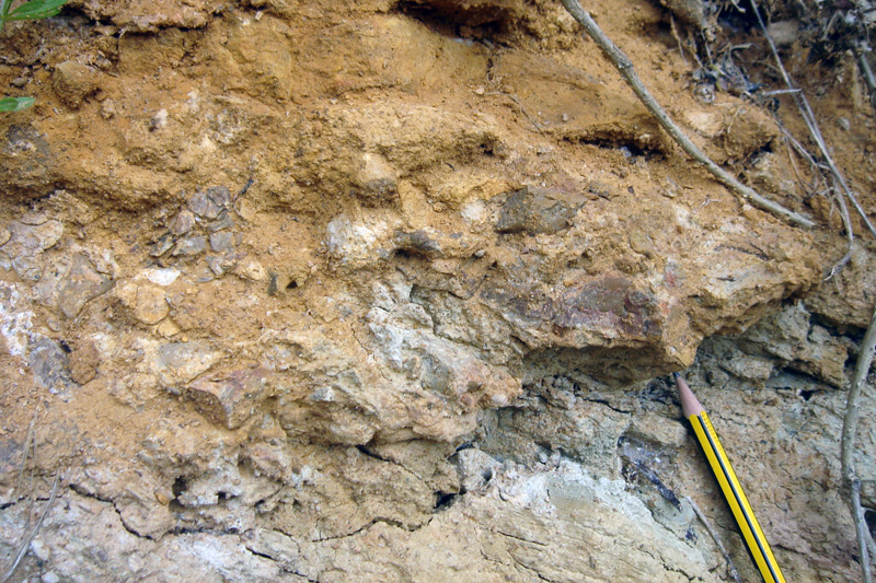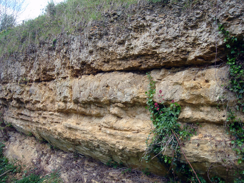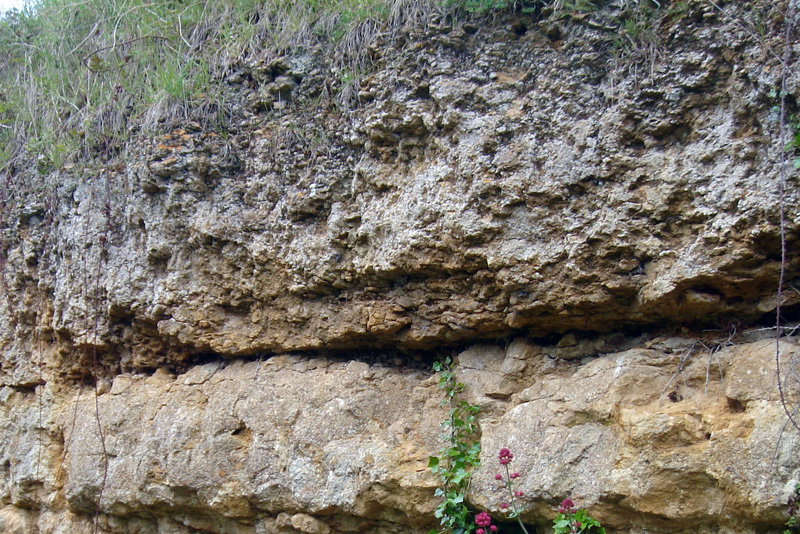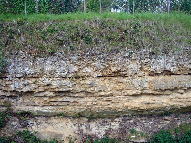 Dans la partie supérieure du front de taille, le dernier banc calcaire (environ 1m d’épaisseur) correspond à la Formation de l’Oolithe ferrugineuse de Bayeux, d’âge bajocien.