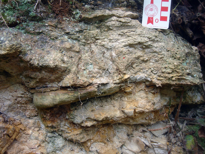 Le conglomérat est surmonté par un lit de calcaire bioclastique grossier à débris d’encrines. |