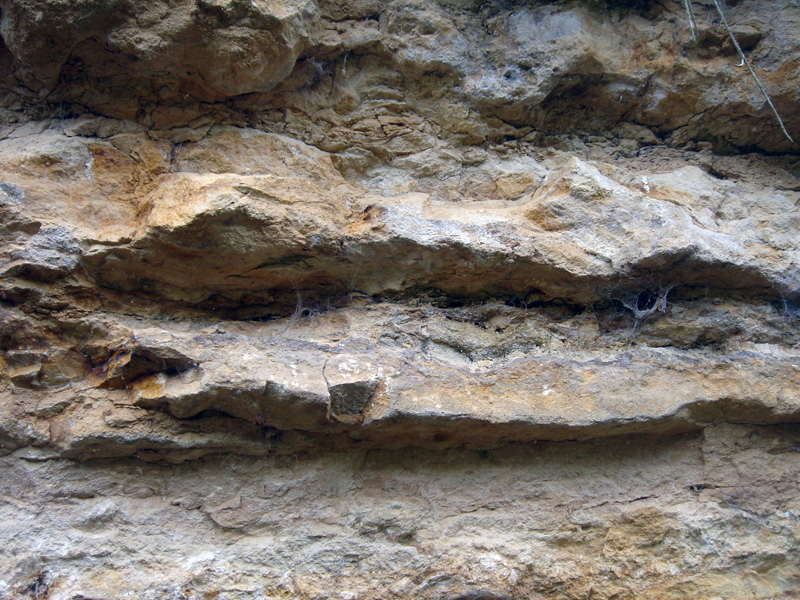 Au-dessus du conglomérat, le calcaire bioclastique grossier renferme de nombreux débris (bioclastes) de crinoïdes, échinodermes vivant fixés sur le fond. Ce calcaire appartient au Faciès des écueils ; il résulte de la consolidation d’un sable formé par l’accumulation des débris des crinoïdes brassés par la houle et les tempêtes à proximité des écueils de grès ordoviciens, vestiges non arasés de la chaîne varisque.