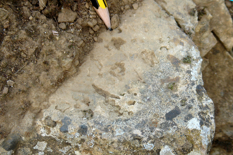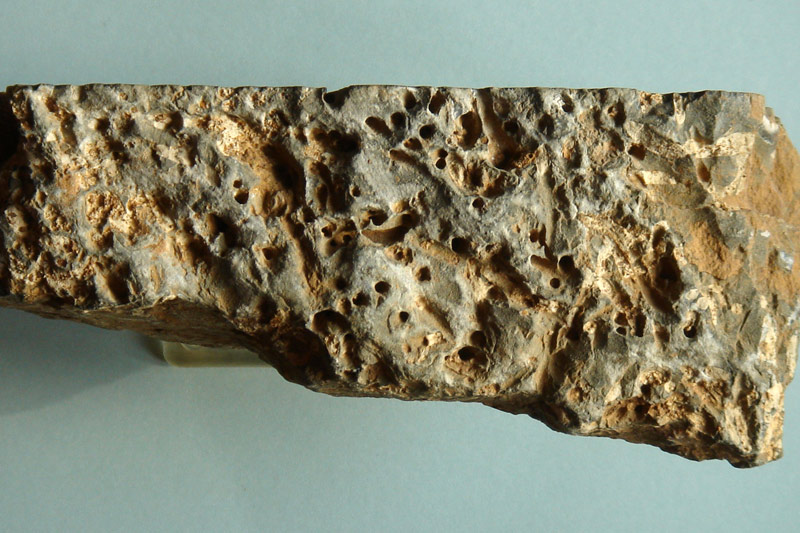 Les perforations de la surface sont l’œuvre d’une faune marine lithophage qui vivait sur le fond lorsque la mer a recouvert la surface d’érosion.
