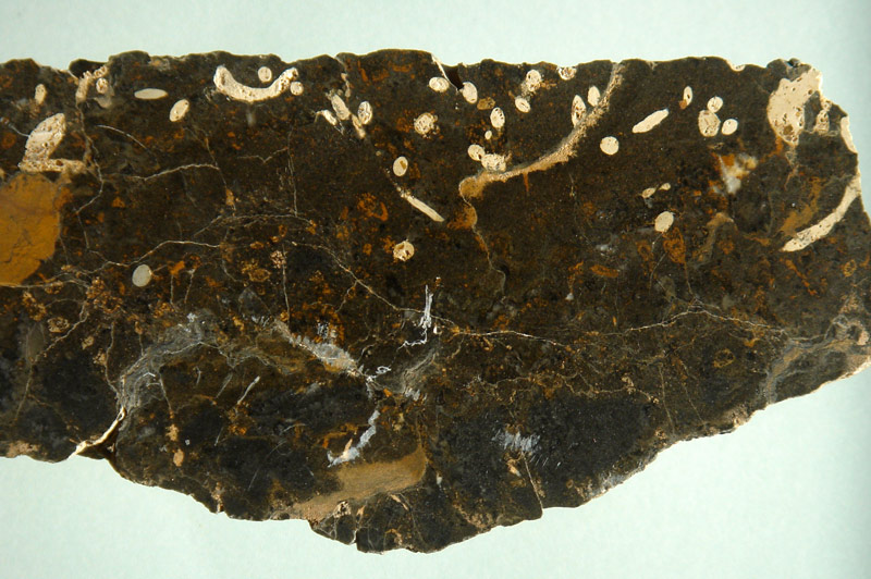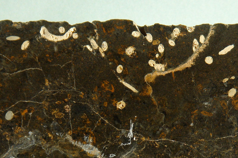 Près de la surface, la section polie recoupe de nombreuses galeries creusées dans le calcaire cambrien et remplies de sédiment jurassique de teinte claire.
