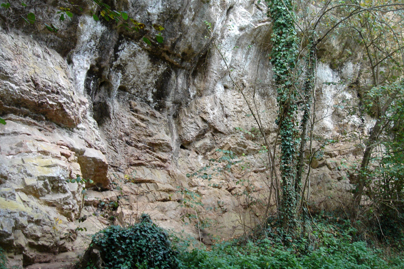 Le chemin qui mène du Musée archéologique au parking monte dans les calcaires du Lias (Jurassique inférieur) qui surmontent les calcaires cambriens de la vallée.