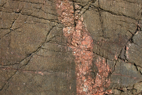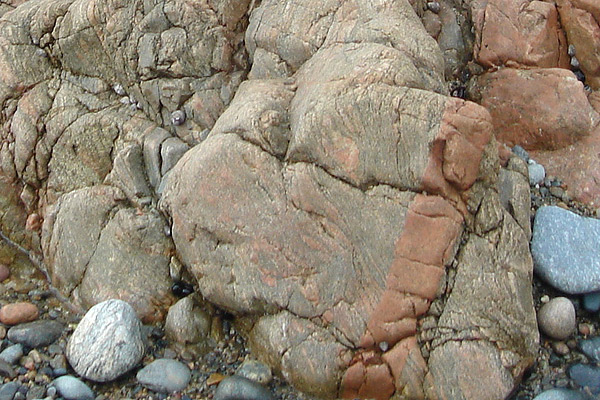 Très fracturés, les orthogneiss œillés du platier rocheux forment une surface irrégulière, polie par les vagues et armée par des filons roses d’aplite saillants.