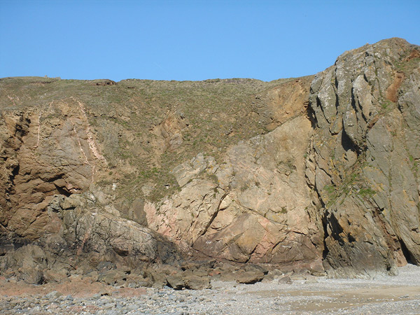 En arrière plan, la paroi rocheuse du fond de l’anse, est constituée d’orthogneiss ; elle est parcourue par plusieurs filons, de dolérite et de lamprophyre, mis en place lors de l’orogenèse varisque.