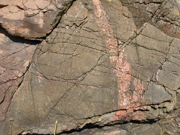 Localement, la foliation des orthogneiss est affectée par des plissotements, visibles de part et d’autre du filon ; ces derniers indiquent que le matériel est devenu malléable (ductile) sous l’effet de la chaleur.