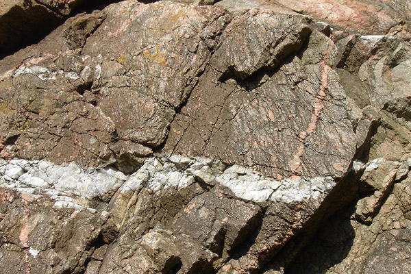 Un filon de quartz subhorizontal traverse la paroi verticale d’orthogneiss.