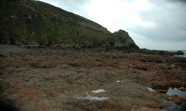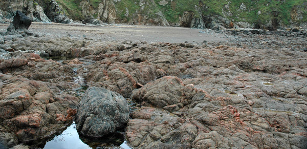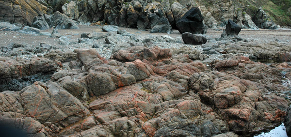 - dans les gros rochers du haut estran au voisinage des paragneiss qui forment la pointe sud de l’anse. On y observe des enclaves et un début de migmatisation (décrit dans la page précédente).