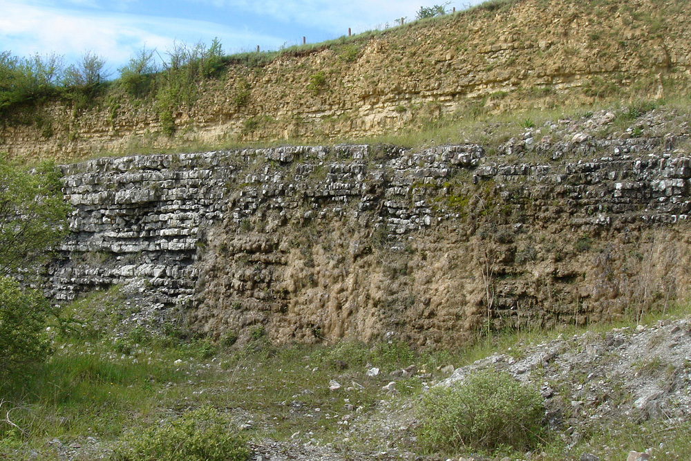 A l’extrémité sud du front de taille NE, les alternances grises marno-calcaires du gradin inférieur sont partiellement masquées par un travertin qui forme une sorte de cascade figée encroûtant les végétaux. A survoler