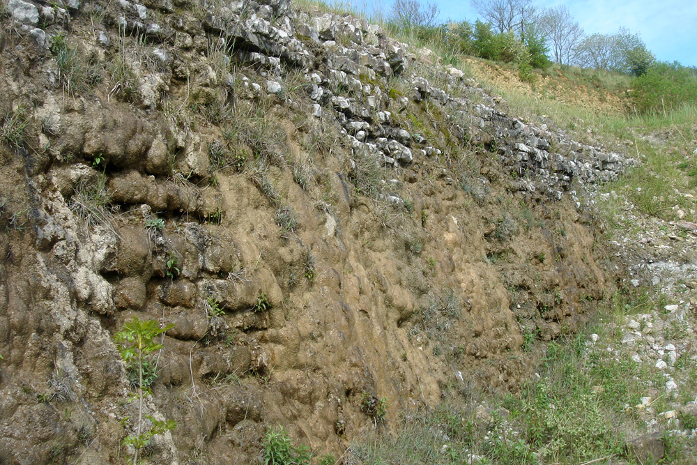 Les concrétions calcaires résultent de la précipitation du carbonate de calcium à l’émergence d’eaux souterraines chargées en calcaire lors de leur circulation dans les marnes.