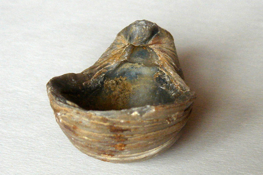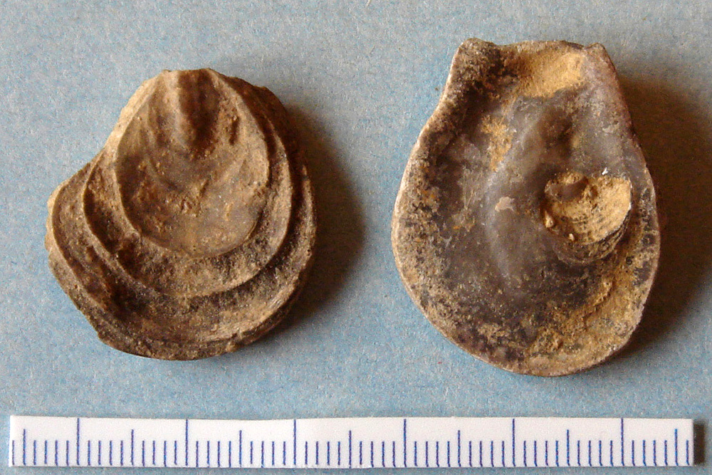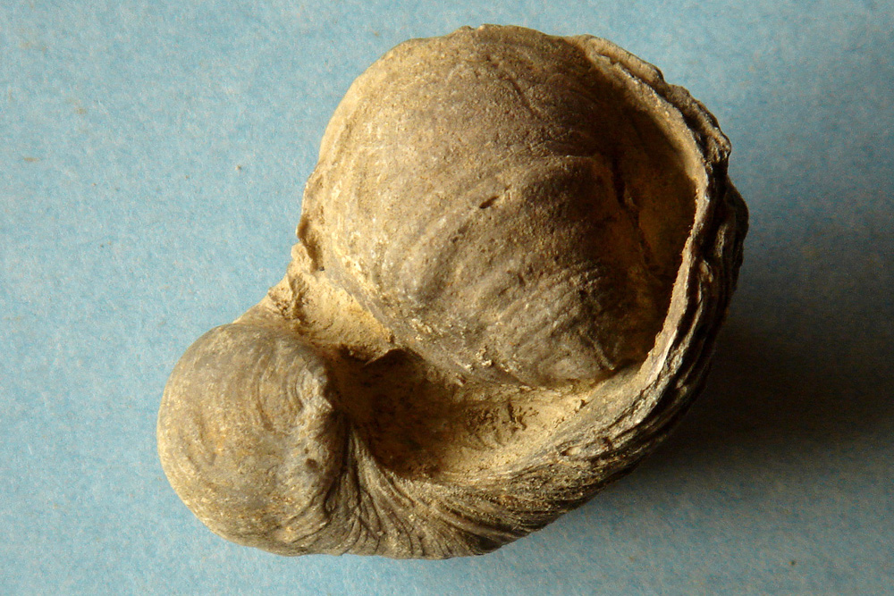 La valve gauche est allongée, arquée, et munie d’un crochet bombé. Elle présente de fortes stries d’accroissement en lamelles bien marquées. |