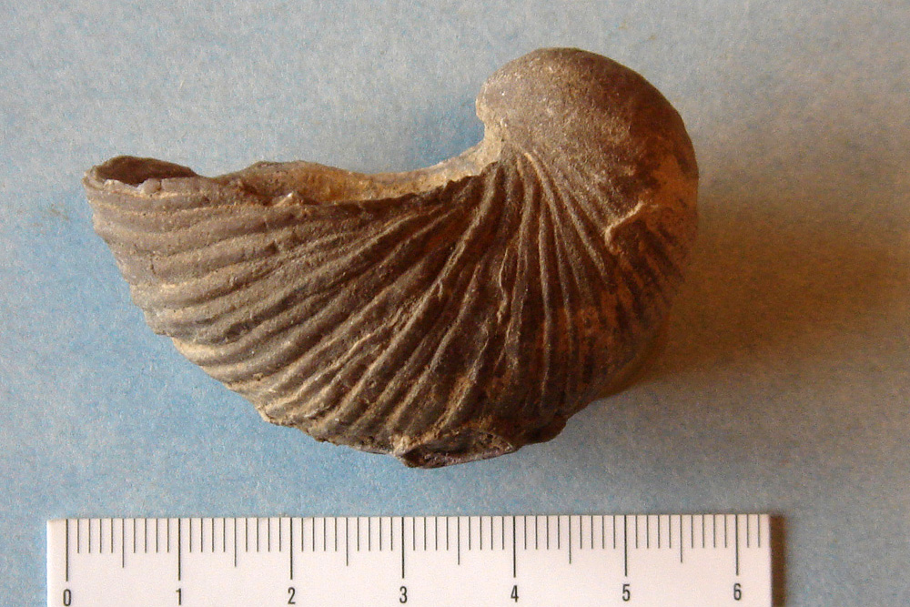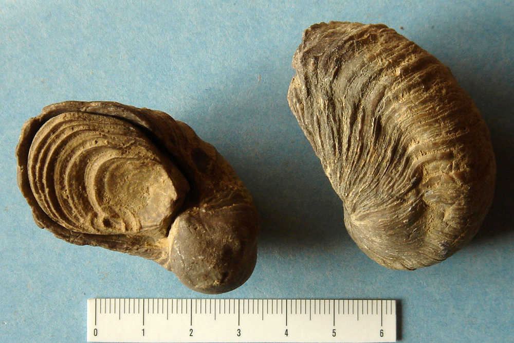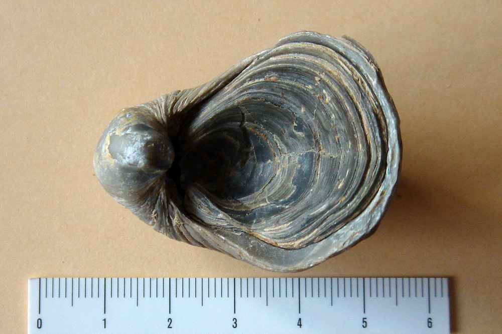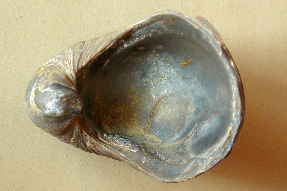 Chez l’espèce Liogryphaea arcuata, les stries se rebroussent en chevrons au niveau d’un sillon longitudinal placé latéralement (d’un seul côté). |