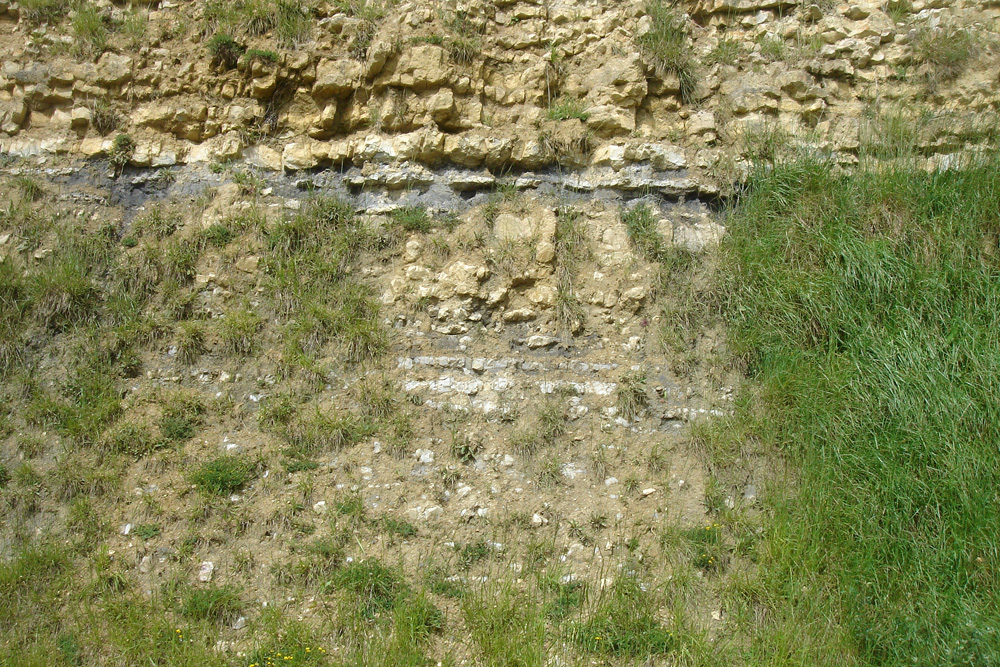 La surface durcie (palier médian) est surmontée par des alternances marno-calcaires riches en fossiles, recouvertes en partie par de la végétation herbacée. A mi-hauteur, on repère deux bancs marneux gris bleu au-delà desquels la série s’enrichit en calcaires et s’appauvrit en faune. |