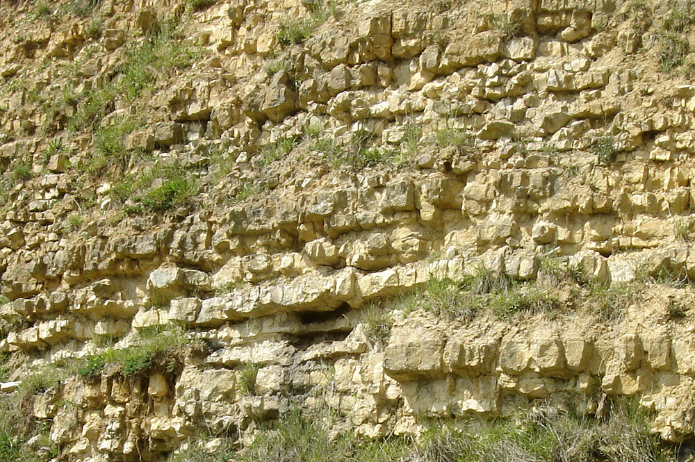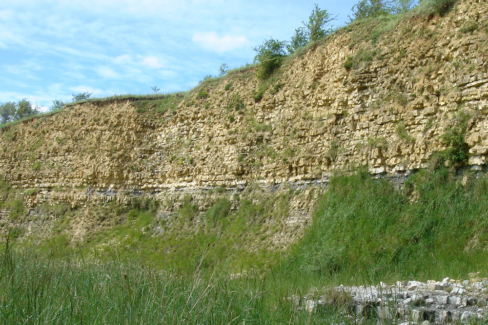 Au dessus du double banc marneux et jusqu’au sommet du front de taille, les bancs de calcaires argileux, beige crème à jaunes, deviennent plus épais et les bancs marneux se réduisent à de minces joints centimétriques. La faune y est moins variée et plus rare