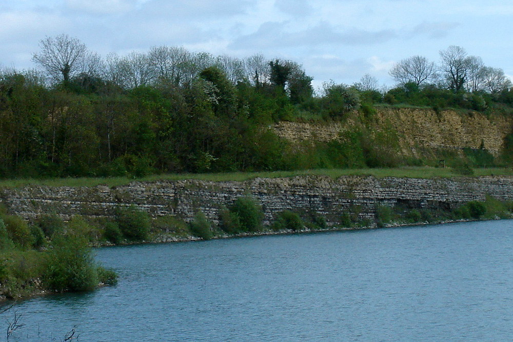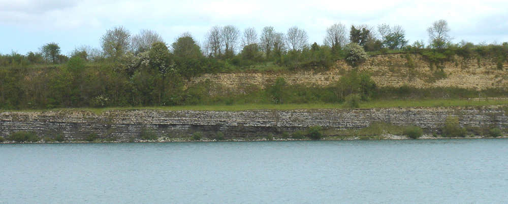 La référence horizontale formée par la surface du plan d’eau permet de visualiser l’inclinaison de l’ensemble des couches sédimentaires vers la droite (Sud-Est).