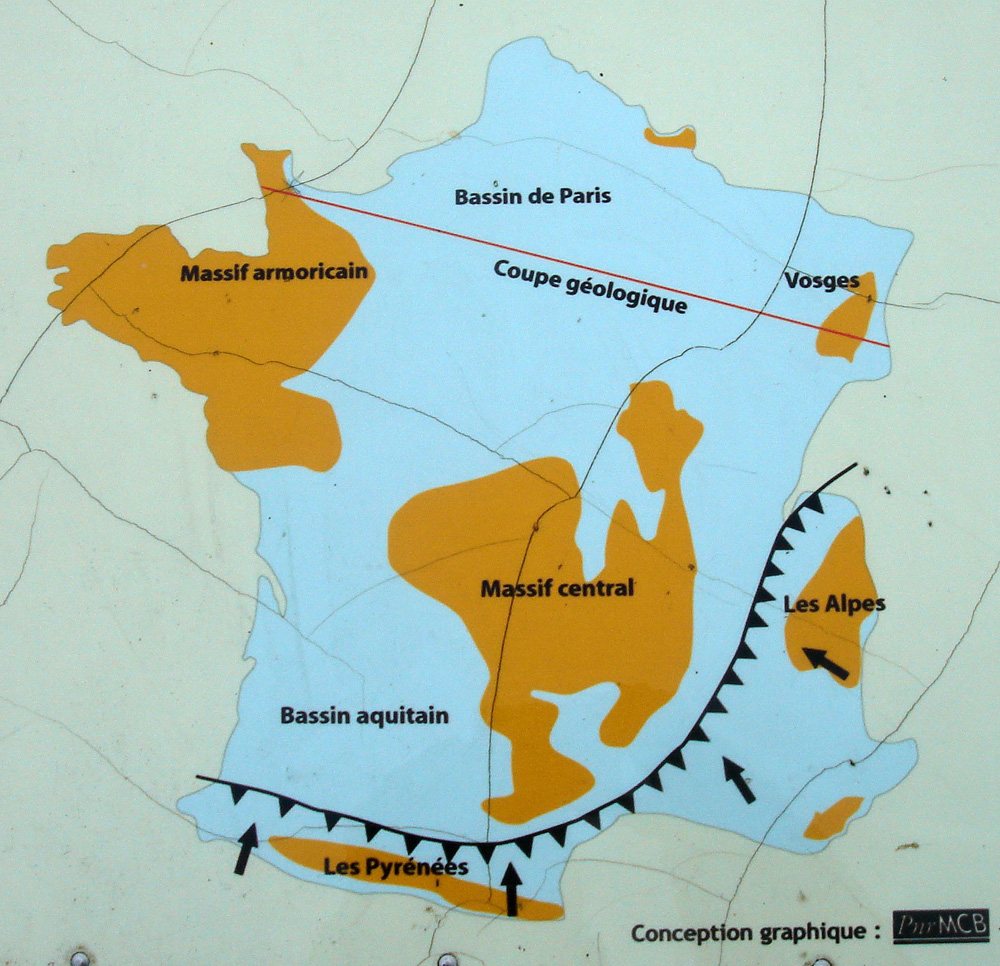La déformation des strates sédimentaires du Bassin de Paris à la fin de l’ère secondaire et au Tertiaire est une conséquence de l’orogenèse alpine au cours de laquelle se sont formées les chaînes de montagnes du Sud de la France, Pyrénées et Alpes. Extrait de la table d’information «Les déformations tectoniques dans le Cotentin» - iconographie réalisée par Lionel Dupret (Université de Caen)