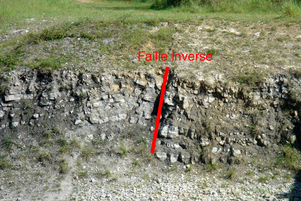 A gauche de la faille, les strates du compartiment Est forment un pli en crochon : elles ont été soulevées et déformées sous l’action de forces de compression ; à droite, les strates du compartiment ouest se sont abaissées. Le rejet de cette faille est évalué à environ 2 mètres. A survoler