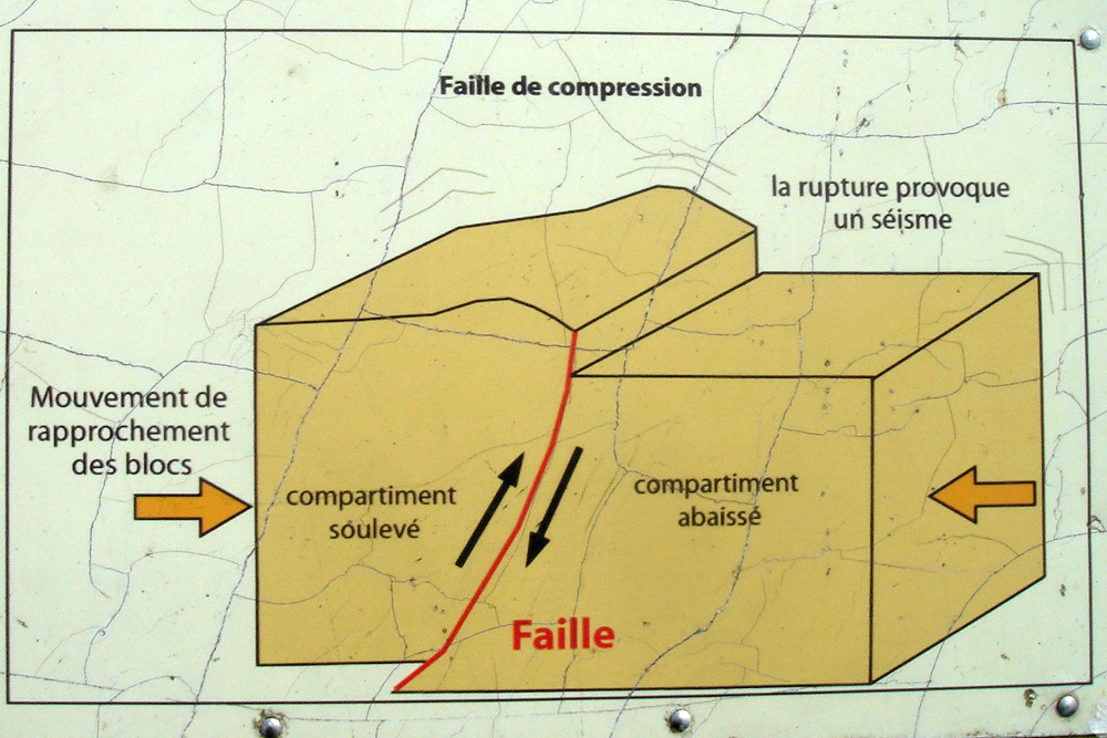 Les contraintes tectoniques ont fait monter le compartiment Est sur le compartiment Ouest, provoquant un raccourcissement de l’ensemble.Cette faille inverse témoigne de contraintes en compression. Extrait de la table d’information «Déformations tectoniques» - iconographie réalisée par Lionel Dupret (Université de Caen)