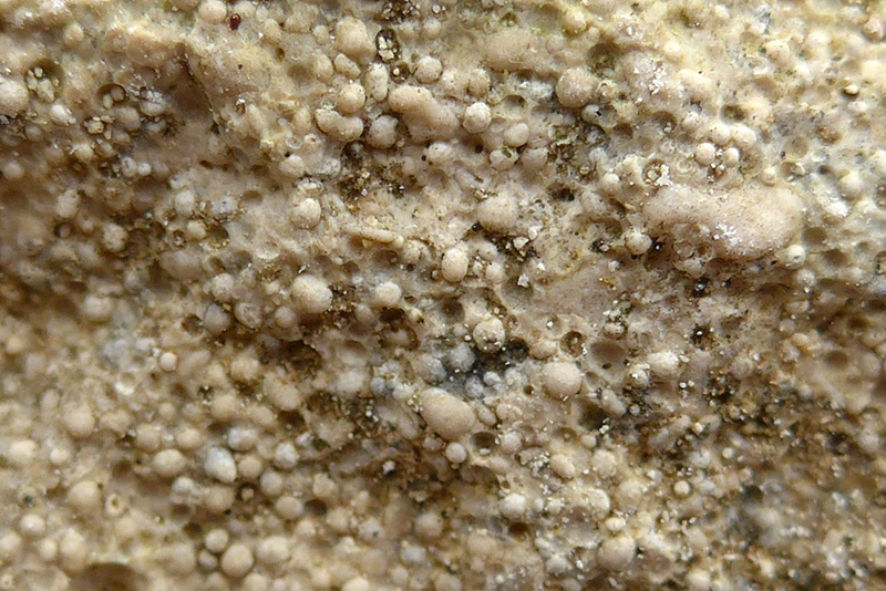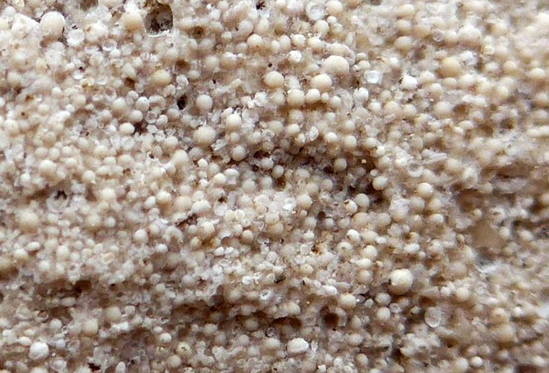 Le calcaire oolithique est formé par l’accumulation d’une multitude d’oolithes, petites sphères de 0,3 à 1 mm de diamètre, constituées de lamines concentriques de carbonate de calcium. La précipitation des carbonates s’effectue dans une mer chaude, elle peut être directe ou favorisée par des bactéries. |