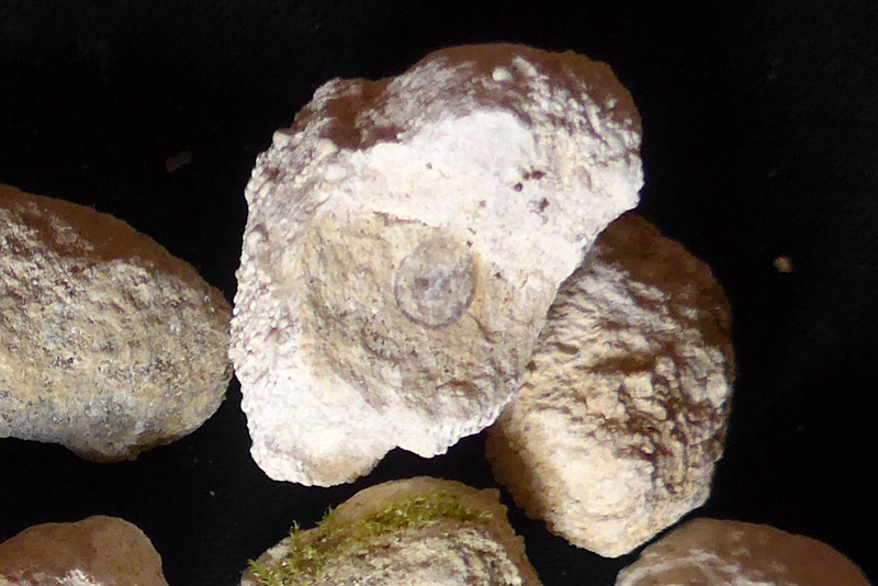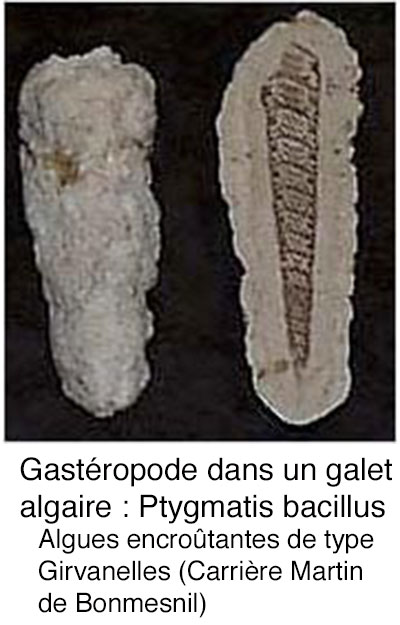 La cassure partielle de cet oncoïde révèle un cercle de calcite qui correspond probablement à une section transversale de coquille de gastéropode fossilisée. Les oncoïdes, encore appelés galets algaires ou « algal balls » sont abondants dans la partie supérieure du front de taille de la carrière de Bon-Mesnil. |