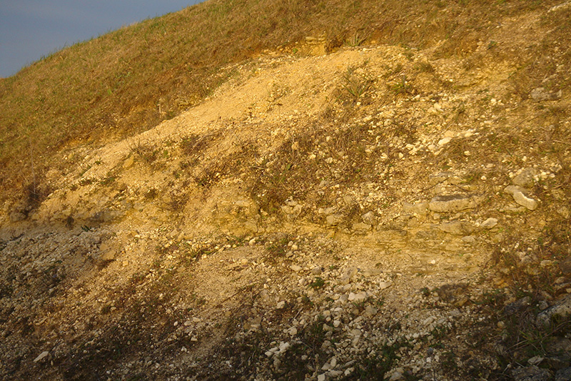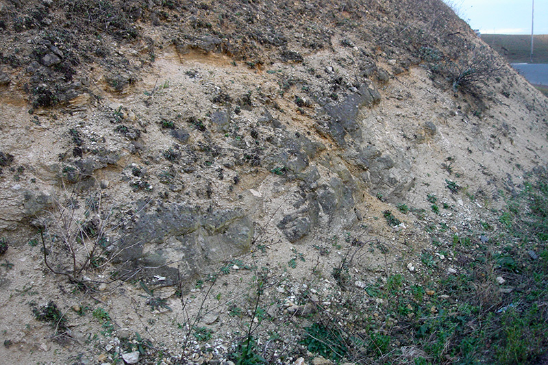 Les talus routiers taillés dans les bancs mal consolidés du Calcaire de Bon-Mesnil présentent des coulées sableuses caractéristiques. C’est le cas des talus de la route à 4 voies située au niveau de la carrière Desloges, au sud de l’échangeur de Soulangy. |