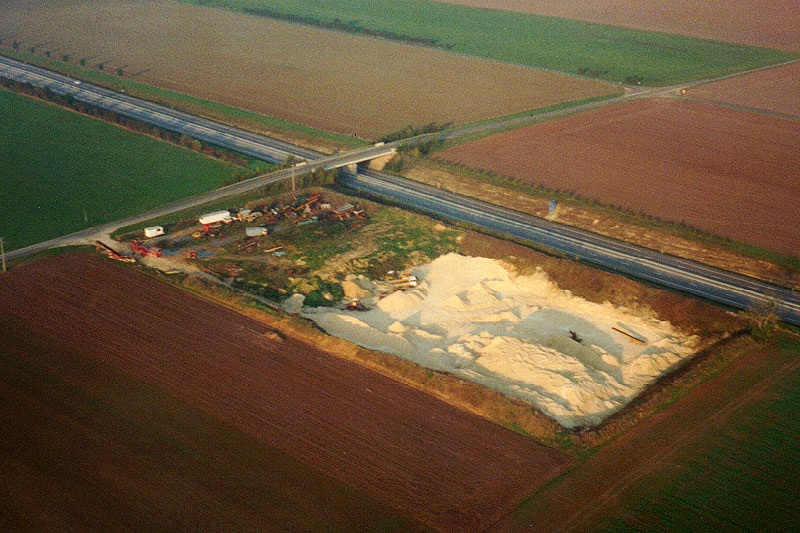 Carrière Desloges Le front de taille Est de la carrière longe la route à 4 voies Caen – Falaise. La carrière a fourni des coupes partielles dans les calcaires oolithiques mal consolidés de la Formation du Calcaire de Bon-Mesnil. La présence de bancs calcaires à litage oblique a permis d’identifier un sens de progradation vers le Nord-Est. Les sables oolithiques y étaient exploités encore récemment pour le chaulage des terres. Vue aérienne prise en 2001 |