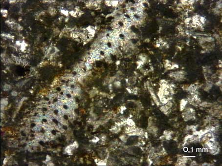 Fine mouture bioclastique constituée de nombreux débris d'entroques, accompagnée de nombreux pelletoïdes subarrondis, très assombris par de la micrite. Gros fragment de test de brachiopode.