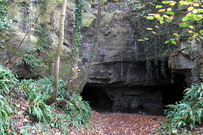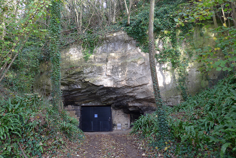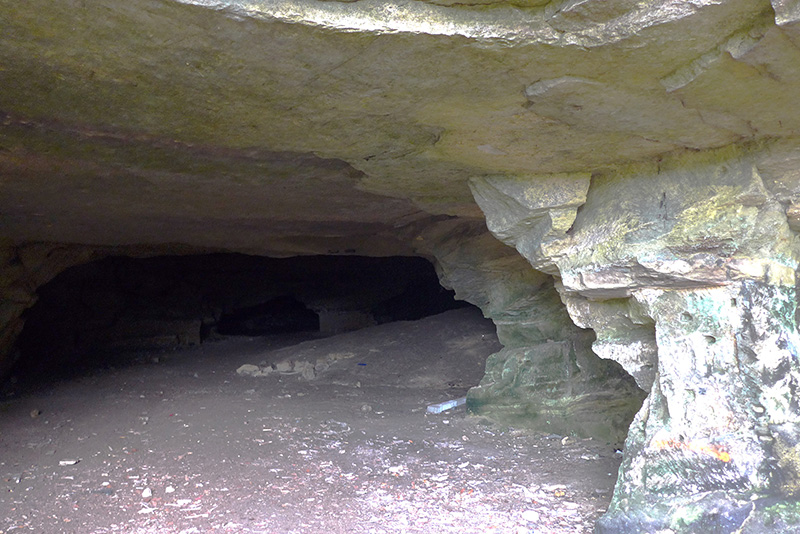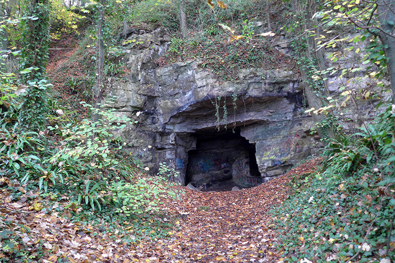 Les entrées de carrières souterraines, ici partiellement comblées, sont toujours localisées au pied d’anciens fronts de taille. A la fin de l’exploitation en front de taille dans le coteau, l’extraction du calcaire a continué en souterrain.