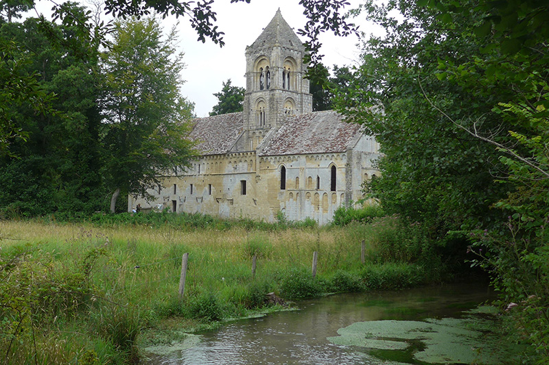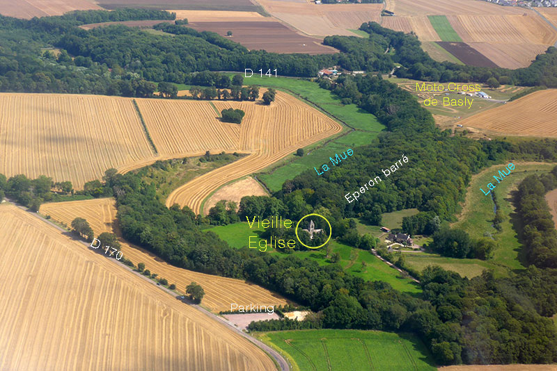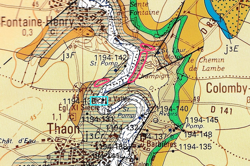 Depuis la vieille église de Thaon jusqu’à la route menant à Fontaine-Henry, le coteau Est de la Mue expose un ensemble remarquable d’anciennes carrières souterraines, toutes situées en bordure de la commune de Basly. |