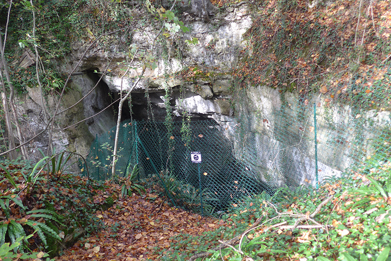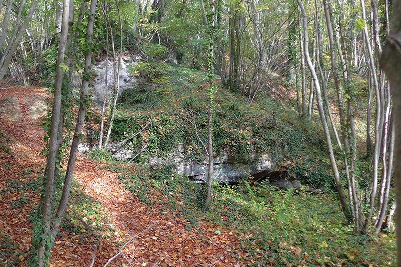 La partie haute du coteau boisé présente des fronts de taille et des cavités souterraines qui lui donnent un aspect chaotique. |