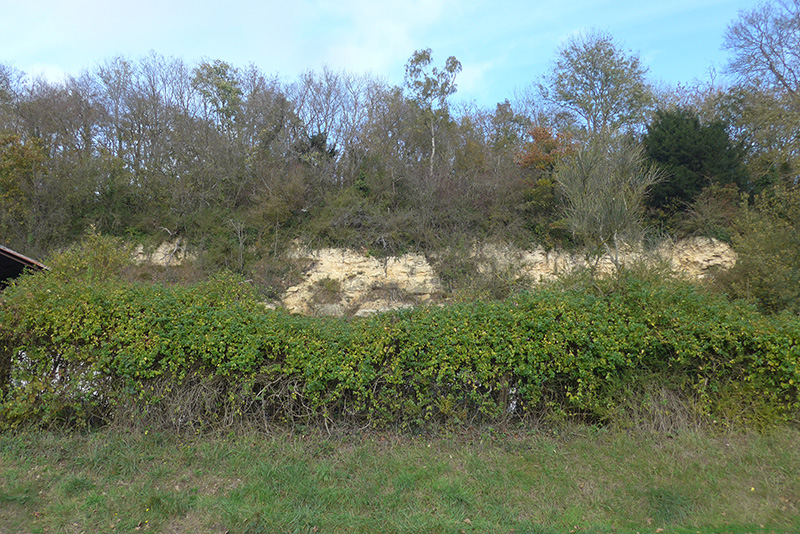Cet ancien front de taille est bien visible depuis la route D141 à la sortie Est de Fontaine-Henry, après le pont sur la Mue et juste avant le virage à droite de la route.