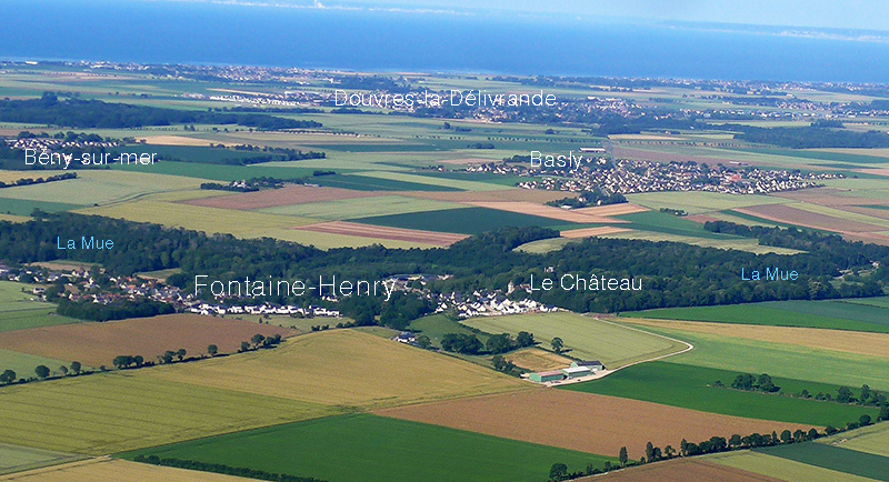 Les affleurements (cercles rouges) sont localisés dans le coteau de la Mue qui borde le plateau de Sente de Fontaine et qui fait face au château (cercle bleu) situé en rive gauche de la Mue. Ce coteau est constitué par le Calcaire de Creully surmonté par la Caillasse de Fontaine-Henry.