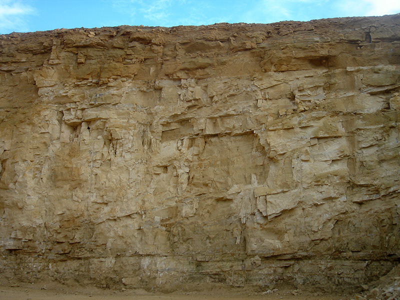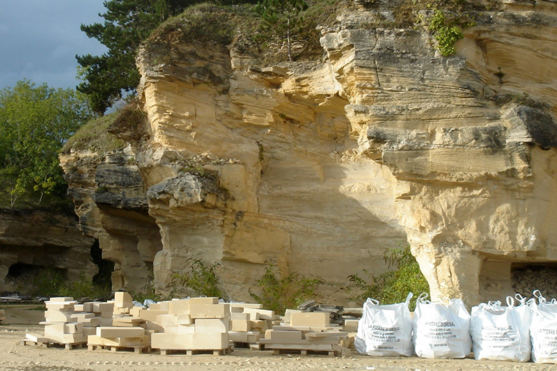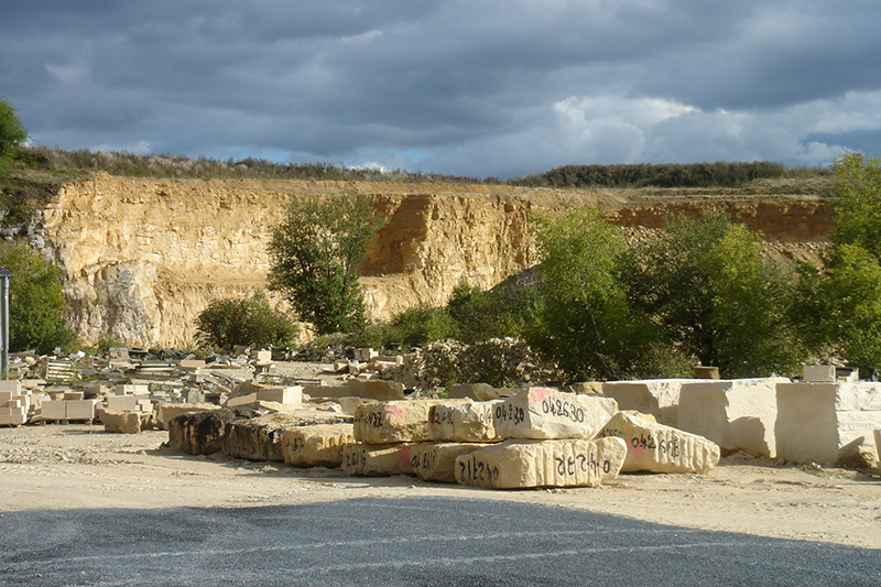 Les fronts de taille actifs du secteur sud-est atteignent une quinzaine de mètres de hauteur. Ils offrent des surfaces peu favorables à l’observation des figures sédimentaires. Au premier plan, des blocs de pierre d’origine variée sont stockés avant leur passage dans les ateliers de taille.