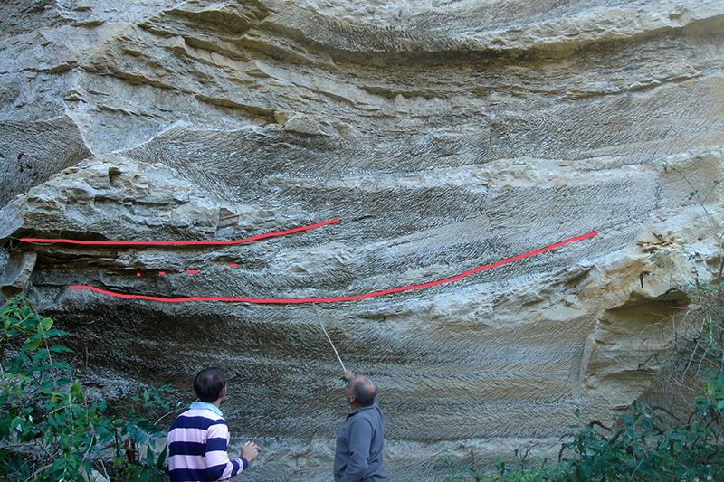 A la base du front de taille, les faisceaux de lits obliques et incurvés témoignent d’une sédimentation soumise aux cycles des marées (tidalites).
