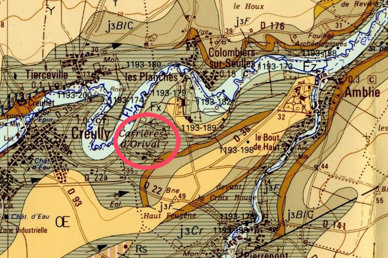 Les carrières d’Orival sont localisées à l’Est de Creully, en rive droite d’un méandre de la Seulles. Le Calcaire de Creully affleure à la faveur du creusement de la vallée de la Seulles qui entaille le plateau calcaire constitué par la Caillasse de Fontaine-Henry et le Calcaire de Blainville surmontés de limons.