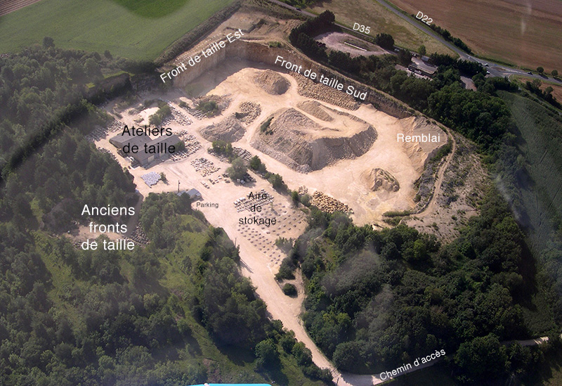 Les fronts de taille actifs sont situés dans le secteur Sud-Est qui a été décapé en surface pour poursuivre l’exploitation. Les matériaux extraits ou destinés à la taille sont entreposés sur les larges surfaces dégagées par le recul des fronts de taille. Des ateliers de taille occupent le secteur Nord-Est.
