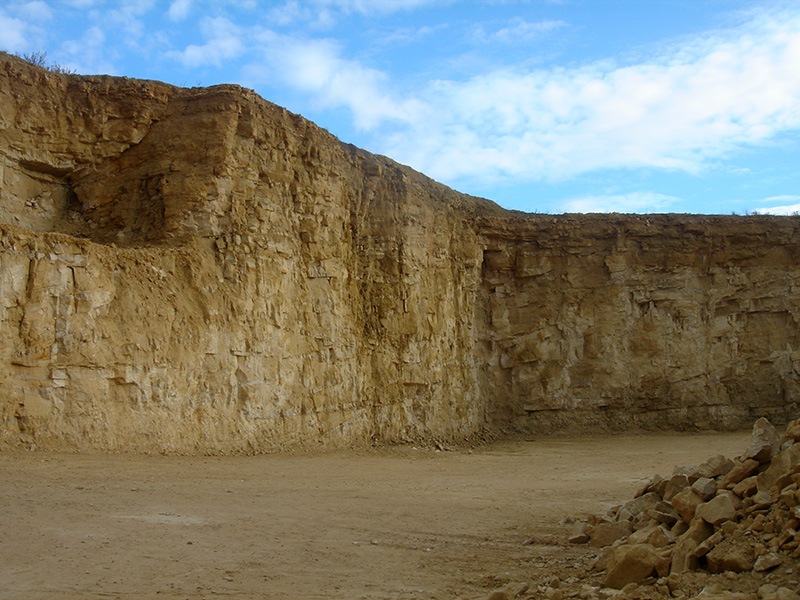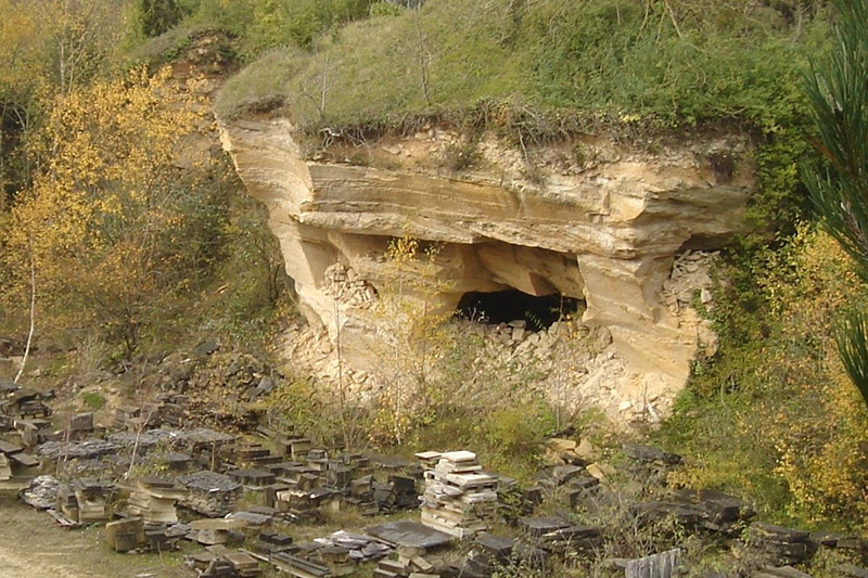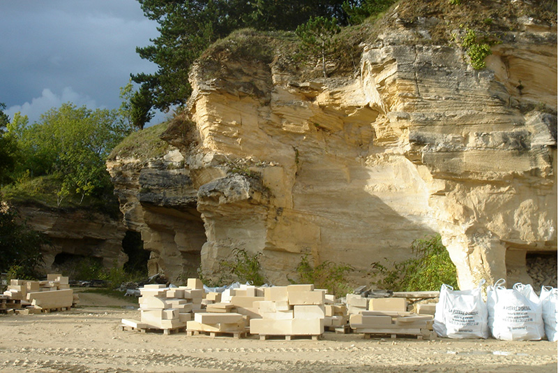 Des cavités sont visibles à la base des fronts de taille du secteur de stockage. Elles résultent de l’extraction artisanale de blocs calcaires par sous-cavage : on délimitait un bloc calcaire en creusant de profondes saignées à la barre à mine ; on y enfonçait des coins de bois qu’on imprégnait d’eau ; le bois gonflait et faisait éclater la roche en provoquant le détachement du bloc calcaire.