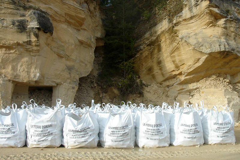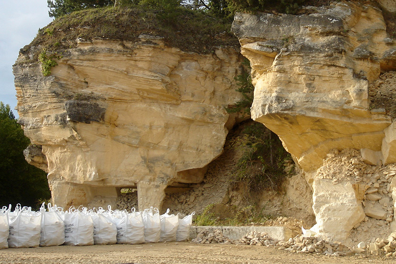 Stockage de sacs de mœllons au pied d’anciens fronts de taille du secteur nord de la carrière. Le cubage de pierre exploitée a triplé de 2017 à 2023, passant de 200 à 600 m3, mais la production reste faible malgré une forte demande. |