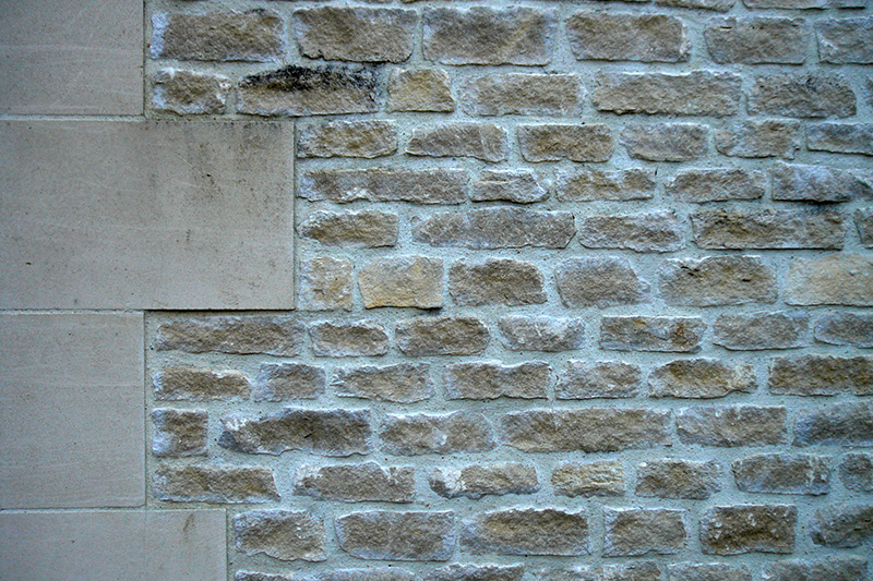 Le mur de mœllons est bordé (à gauche) par un appareil en pierre de Caen, pierre plus fine et plus claire. |