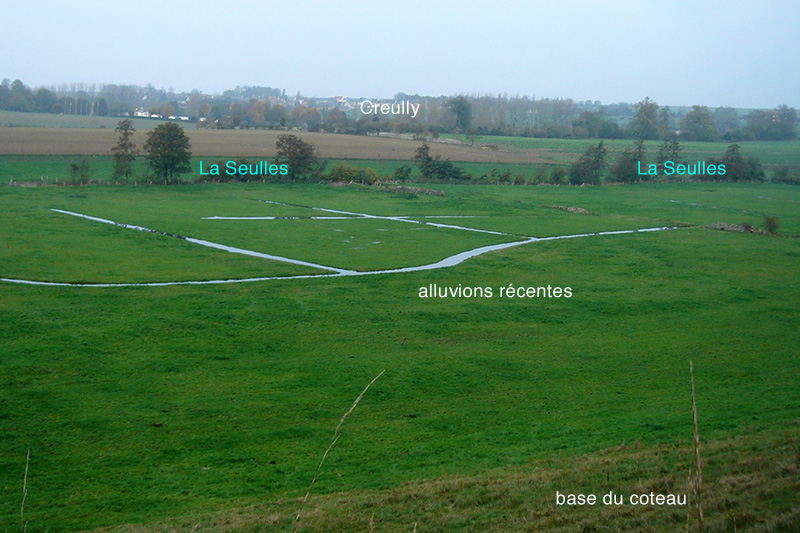 En période pluvieuse, les eaux de la Seulles s’étalent sur les alluvions récentes (Fz) jusqu’au pied du coteau calcaire.