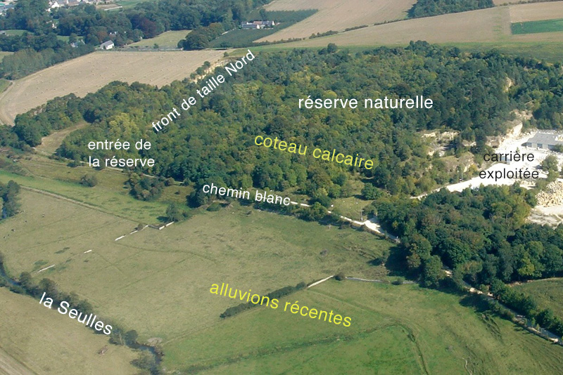 Depuis le coteau, le « chemin blanc », qui mène à la carrière et à la réserve, offre une vue sur la vallée de la Seulles dont le cours sinueux est souligné par une haie d’arbres. Le fond plat de la vallée correspond aux alluvions de la Seulles (Fz sur la carte géologique).