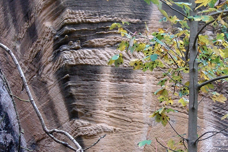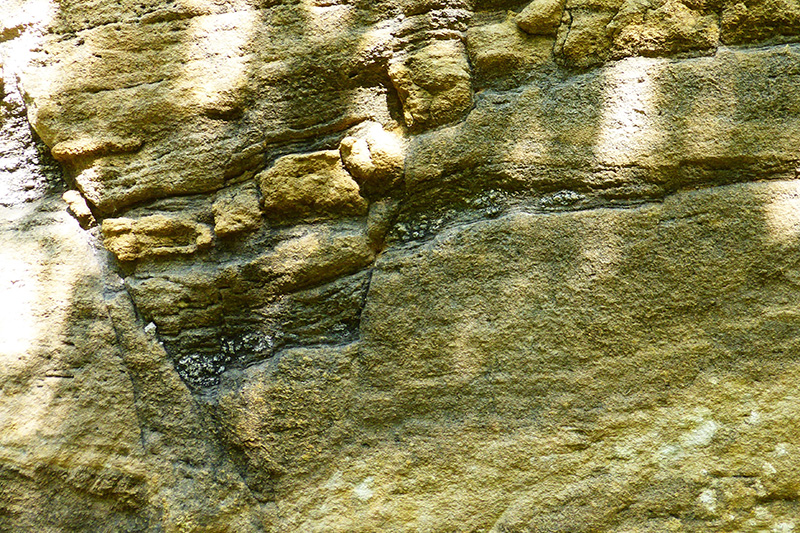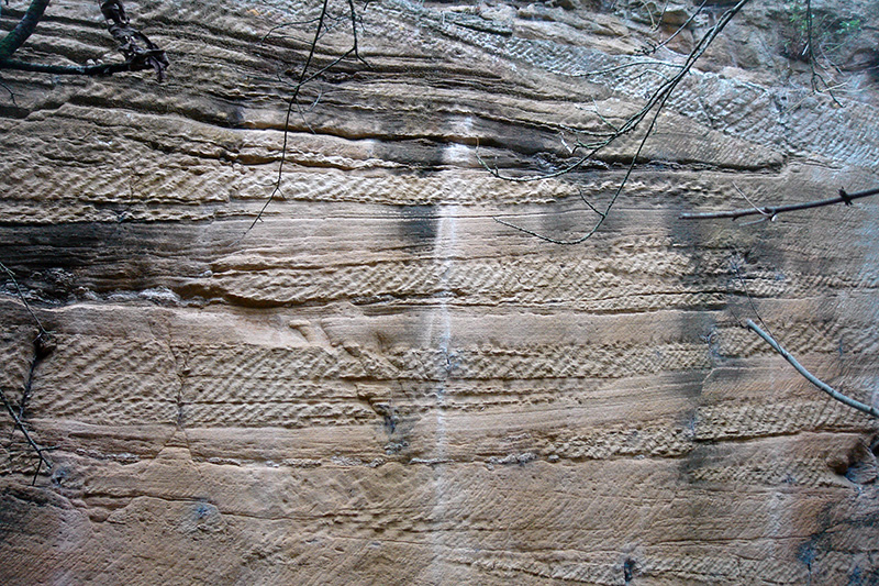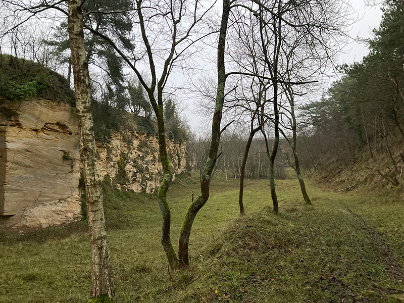 Dans la partie Sud, plusieurs fronts de taille exposent des litages obliques et autres structures sédimentaires. Ces fronts de taille sont mieux visibles en hiver, quand les arbres sont dépourvus de leurs feuilles.