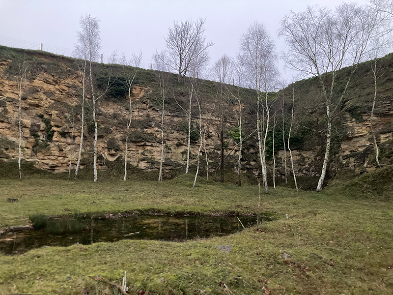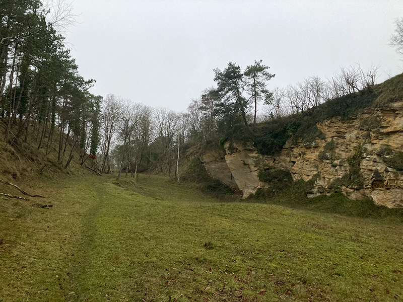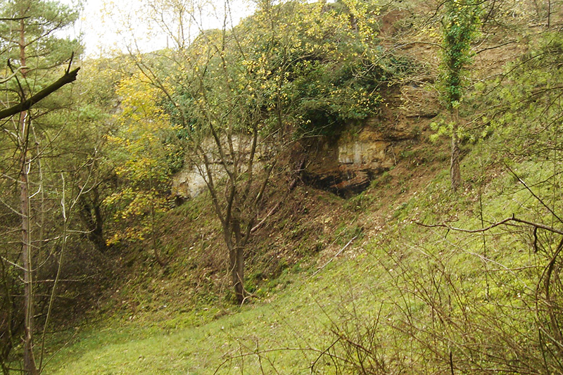 Le fond de l’ancienne carrière marque l’angle NE de la réserve. La stratification est encore bien visible et les bancs peuvent être suivis tout le long du front de taille. Le secteur abrite une petite mare qui présente une biodiversité intéressante. |