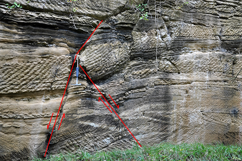Deux petites failles normales conjuguées interrompent la continuité des bancs. Les compartiments latéraux, situés à gauche et à droite du compartiment central, se sont affaissés. Ce dispositif témoigne d’un contexte d’extension.