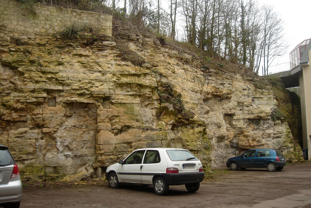 A droite du Calvaire, le front de taille se poursuit vers le Sud-Ouest, sous la rue du Magasin à poudre. D’une hauteur de 6 à 8 m, il délimite le parking d’une Résidence pour étudiants, où il apparaît bien dégagé et accessible. Des formes en auge sont visibles vers le fond du parking (au niveau de la voiture bleue, sur la photo). Au sommet du front de taille, la passerelle relie l’immeuble à la rue du Magasin à poudre.